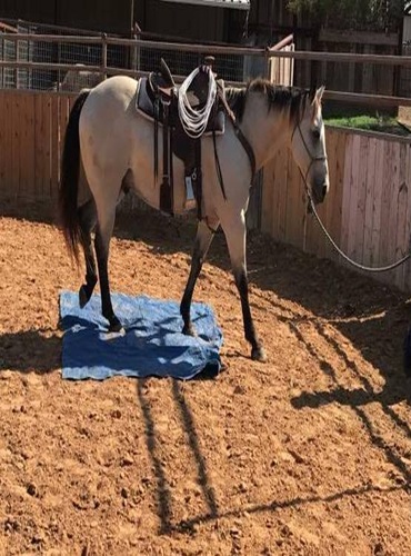 well broke, good-looking buckskin that you can show off on. He has a color that every cowboy loves, zebra striping on his legs, and faint dapples.