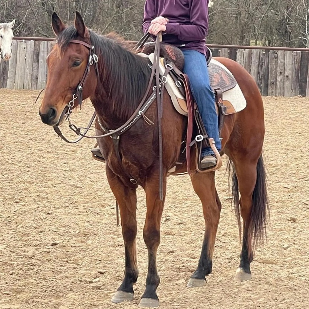 Solid Laredo, also known as “Laredo Royal Bodee”, is a 6-year-old, 15.1h bay gelding we have owned for nearly 2 years. He has been shown in ranch horse events and earned a buckle in the green horse class.